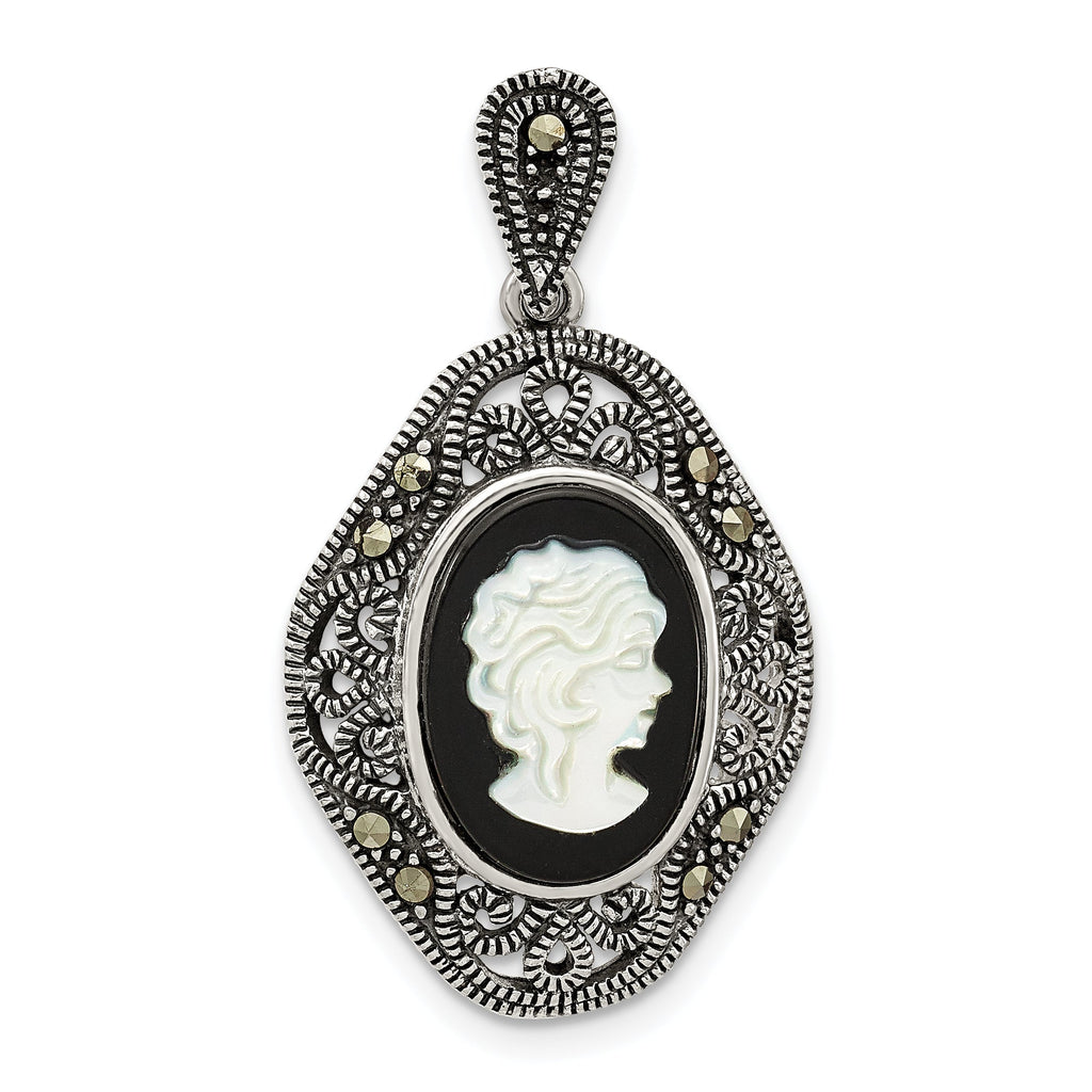 Sterling Silver Antiqued Marcasite Black Agate & MOP Cameo Pendant