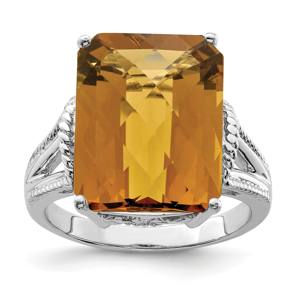 Sterling Silver Rhodium Octagonal Checker-Cut Whiskey Quartz Ring