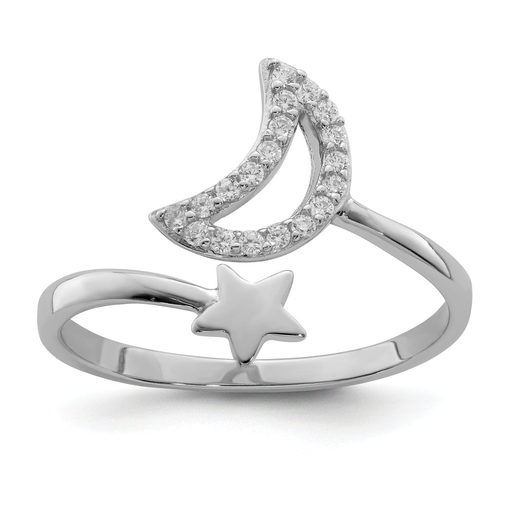 Sterling Silver Rhodium-plated CZ Moon and Star Ring