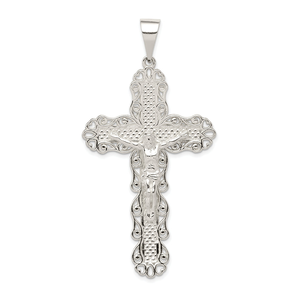 Sterling Silver Polished & Textured Large Floral Cross w/Jesus Pendant