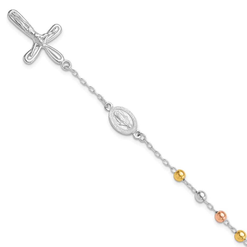 Sterling Silver Rh-plated Rose and Gold-Tone Cross Rosary Bracelet