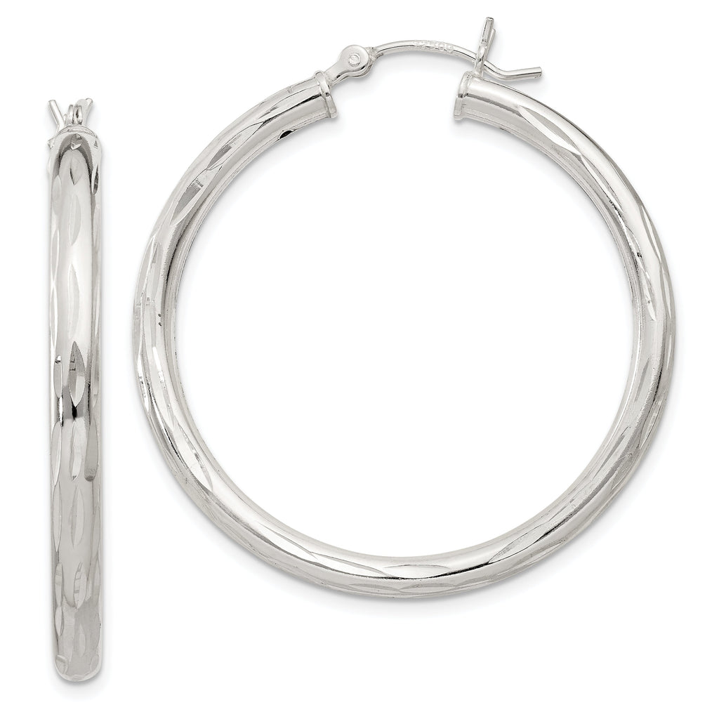 Sterling Silver Diamond-cut Satin 3x35mm Hoop Earrings