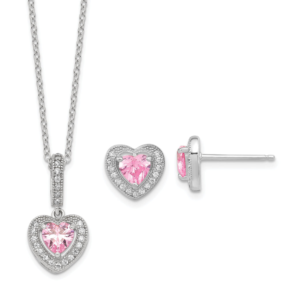 Sterling Silver Rhodium-plated Polished Clear and Pink CZ Heart 18 inch Necklace and Heart Post Earring Set