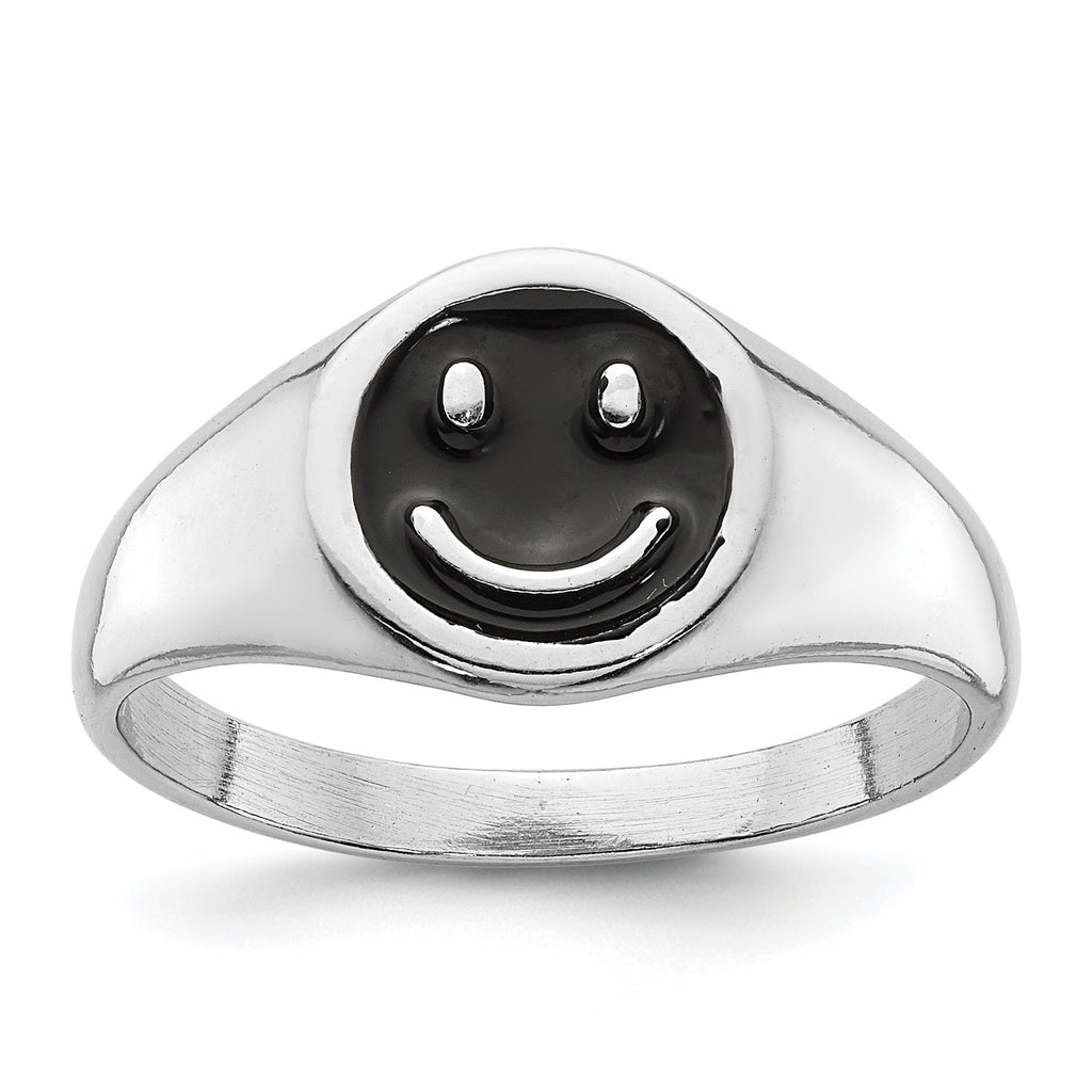 Sterling Silver Rhodium-plated Black Enamel Smiley Face Ring